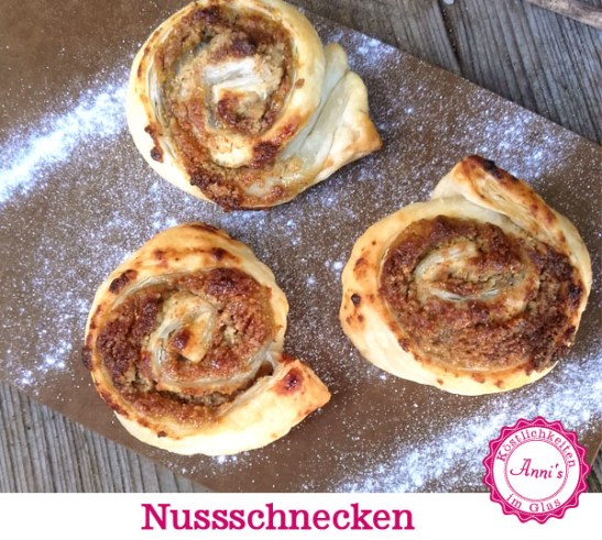 Für die schnellen Nussschnecken eine Packung Blätterteig aufrollen, zu zwei Dritteln mit Birne Zimt Fruchtaufstrich bestreichen. Die geriebenen Walnüsse darüber streuen. Zu einer Roulade zusammenrollen und in Scheiben schneiden.