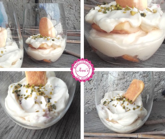 Abwechselnd eine Schicht Biskotten und eine Schicht Mascarpone in ein Glas geben. Mit Mascarpone abschließen. Mit gehackten Pistazien und Biskotte dekorieren.