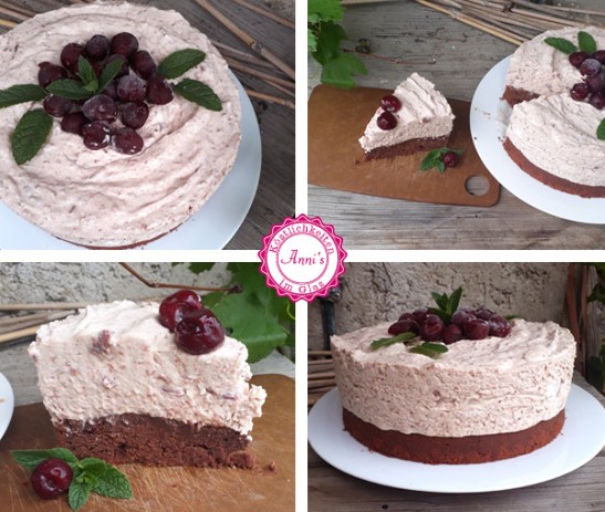 Vor dem Servieren mit Weichseln und Minzeblättern dekorieren, fertig ist die sommerliche Variante einer Schwarzwälder Kirsch Torte.