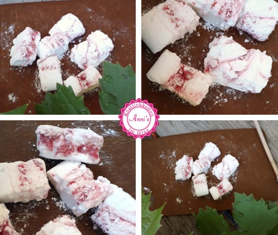 Die Speisestärke mit dem Puderzucker verrühren und einen Teil davon auf die Marshmallow Masse sieben. Alles mindestens 24 Stunden zum Austrocknen stehen lassen.
