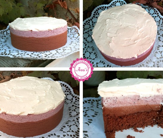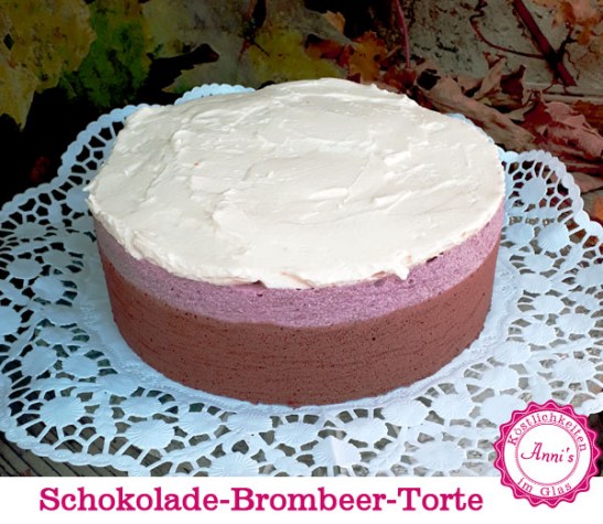 Den Biskuittboden mit etwas Brombeer Fruchtaufstrich bestreichen. Den Rand der Tortenform mit einem Backpapierstreifen auslegen und wieder über das Biskuitt stülpen. Schokoladenmousse auf das Biskuitt in die Tortenform gießen, glatt streichen und über Nacht kalt stellen.