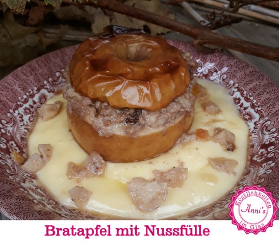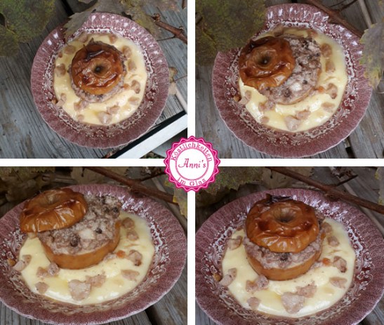 Die Äpfel in eine Auflaufform stellen, mit der Nussmasse füllen und mit den abgeschnitten Apfelkappen zudecken. Mit Apfelsaft aufgießen und im vorgeheizten Backrohr bei 160 °C ungefähr 45 – 60 Minuten backen. Wenn notwendig zwischendurch mit Apfelsaft aufgießen. Die Auflaufform darf nicht austrocknen.