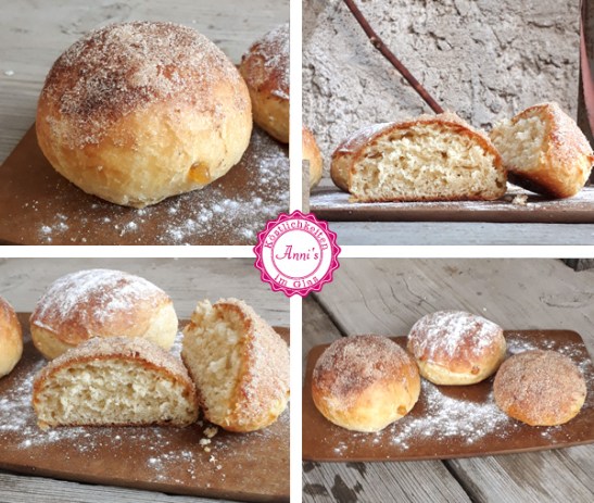 Wer will kann die warmen Krapfen mit zerlassener Butter bestreichen und in einem Zucker-Zimt Gemisch wälzen.