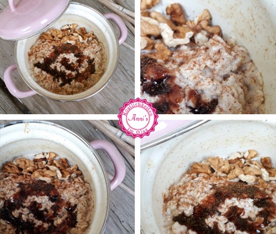 Für den Porridge die Milch unter ständigem Rühren zum kochen bringen. Von der Platte nehmen und die Haferflocken einrühren. Quellen lassen bis ein Brei entsteht – wir haben den Porridge über Nacht im Kühlschrank stehen gelassen.