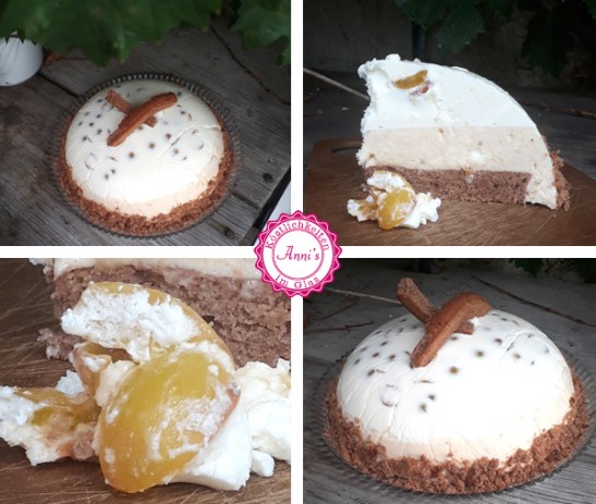 Die Kriecherlcreme auf der hellen Creme verteilen. Bei Bedarf den Tortenboden zurecht schneiden und vorsichtig an die Kriecherlcreme andrücken. Sollte der Boden zu klein sein, dann so weit in die Creme drücken, dass die überlaufende Creme und der Tortenboden bündig abschließen. Immerhin sollte die Kuppeltorte eine ebene Unterseite haben um gerade zu stehen.
