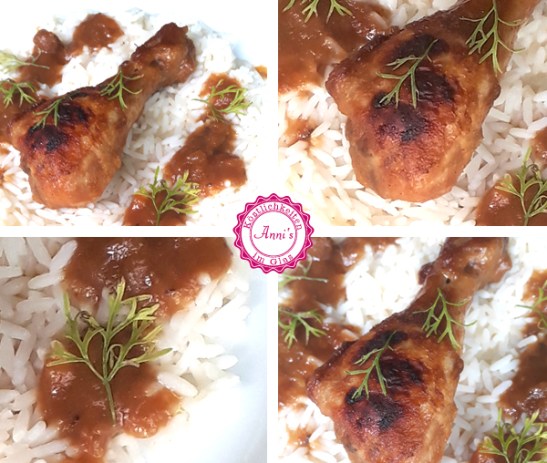 Das Rezept eignet sich auch für den Grill. Dabei werden die Hühnerkeulen aus der Marinade genommen und nur zwischendurch damit bepinselt.