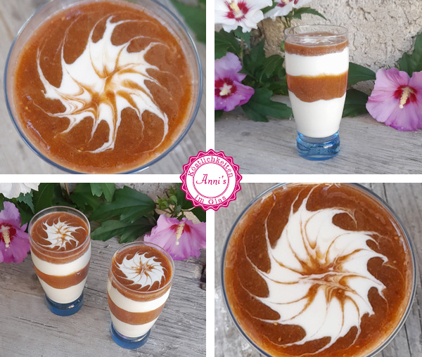 Wir haben für das Foto die gesamte Masse in zwei hohe Gläser geschichtet. Das kann man auch machen – so entstehen 2,5 Portionen. War uns dann aber beim Essen einfach zu viel auf einmal. Deshalb empfehlen wir, die Masse auf 5 Gläser zu verteilen.