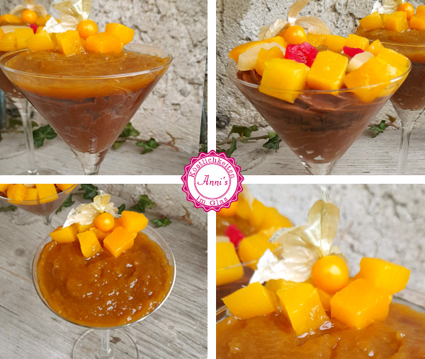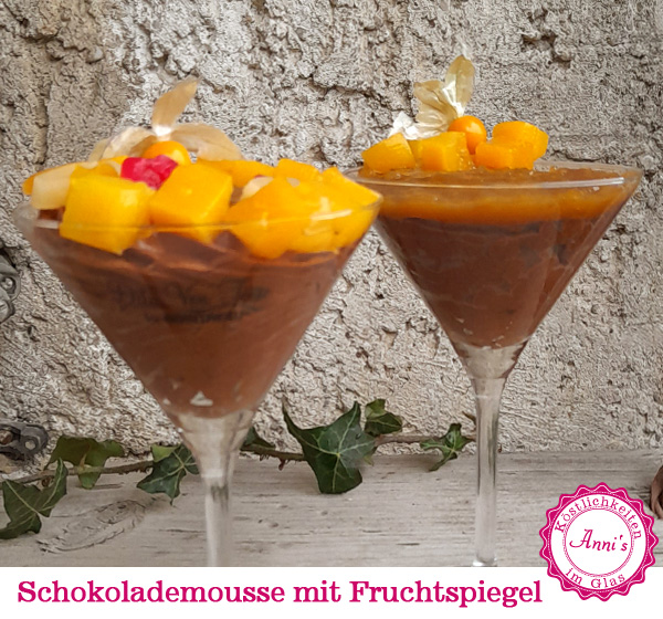 Für den Fruchtspiegel den Mango-Maracuja Fruchtaufstrich glatt rühren und auf dem Schokomousse verteilen. Mit (Dosen)Früchten dekorieren und genießen.