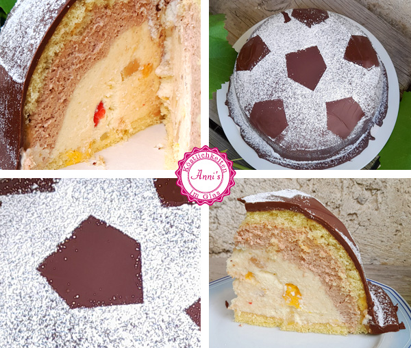 Kaum zu glauben. Österreich war Gruppensieger bei der EM. Da werden sogar wir zu Fußball Fans. Nix für ungut, aber wie schauen uns während der EM halt lieber an wie Jakob Schubert zum xten Mal im Vorstieg gewinnt. Vielleicht sieht unsere Fußball Torte deshalb etwas extravagant aus. Aber nach mehrern Versuchen schmeckt sie nun wenigstens. Denn das eigentliche Rezept war mit viel mehr Alkohol, Kaffee statt Kakao und kandierten Früchten. Leider nicht unser Geschmack. Also her mit dem Kakao (übrigens in dem Fall mit Wasser angerührt) und den saftigen Früchten und weg mit dem überschüssigen Alkohol (das Biskuitt sollte noch in einer Mischung aus Amaretto und Cointreau getränkt werden). So kann sie online und ist richtig gut. Allerdings auch sehr viel – deshalb lieber nur backen, wenn sich Besuch ankündigt!
